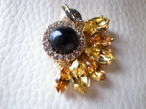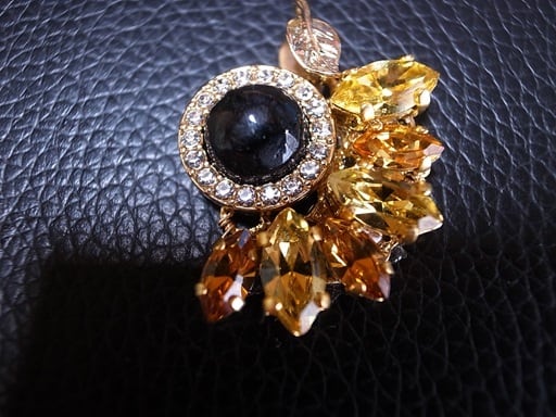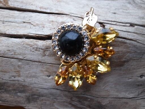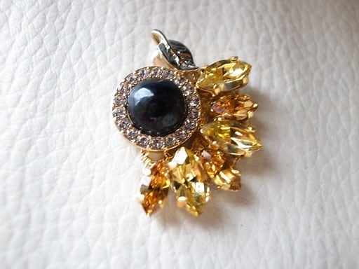 八神純子さんのコンサートで披露された「負けないわ」は素敵な曲でした。彼女の強さとしなやかさを表現したいと思い、「ひまわり」のピアスに続きネックレス・ヘッドを製作しました。黒い部分は、オニキスをカットして磨きました。黄色い部分はゴッホをイメージしたスワロフスキー社のパーツを使っています。