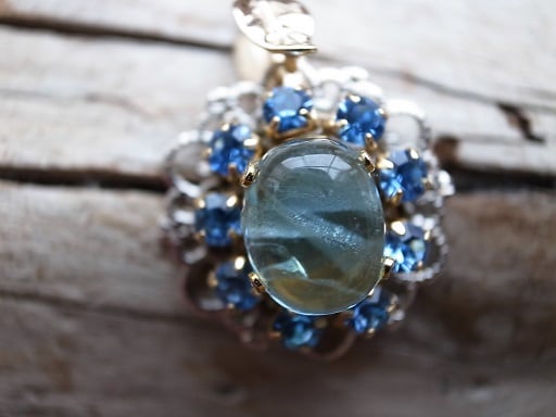 アクアマリンでネックレスヘッドを作りました。アクアマリンの粉は、肺に入るとよくないので、日本で磨く人はほとんどいないと思います。ベリル系特有の雨といわれる線が入っていますが、本製品は、あえてガラス浸透させていません。先日のまつこさんのTVでも、アクアマリンを扱っていましたね、数億円でした。