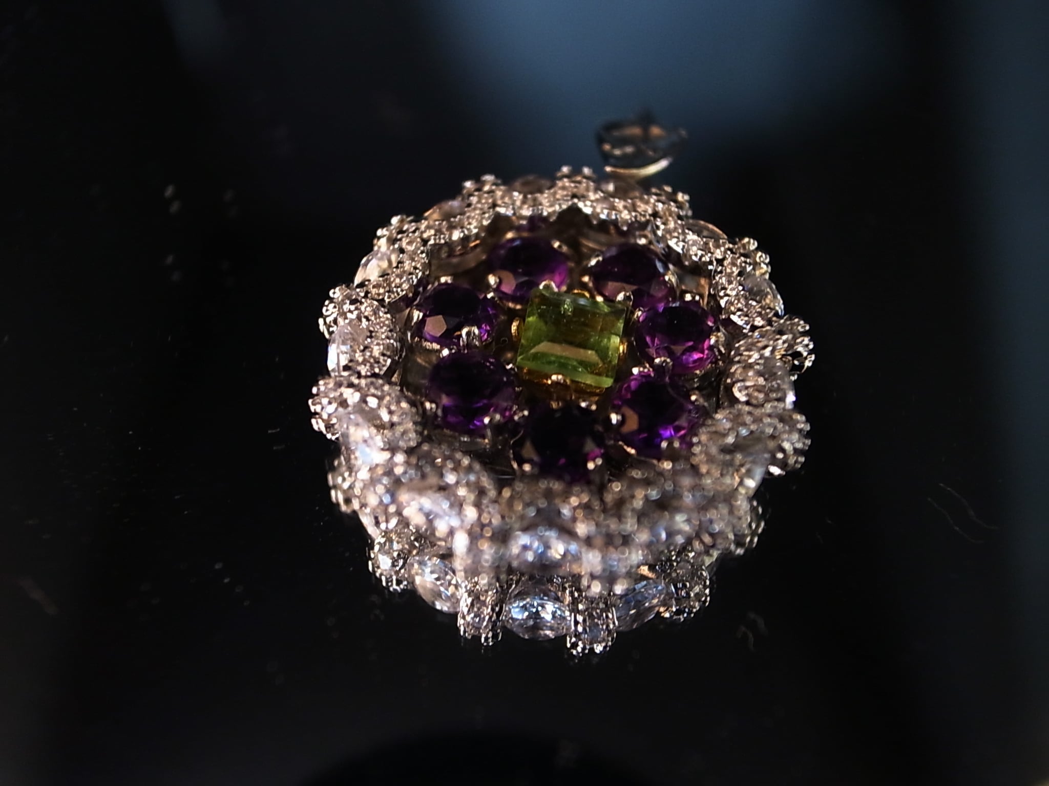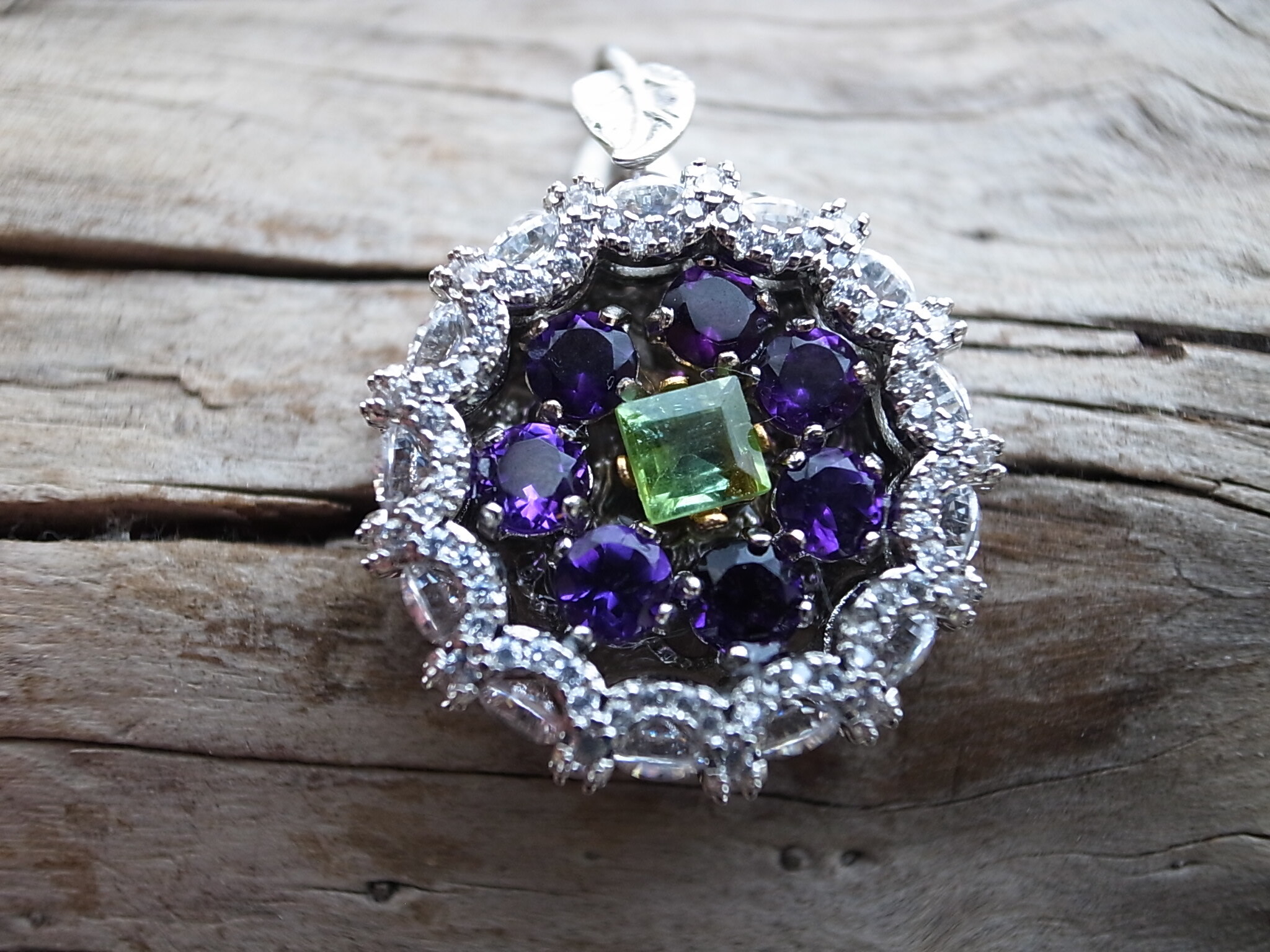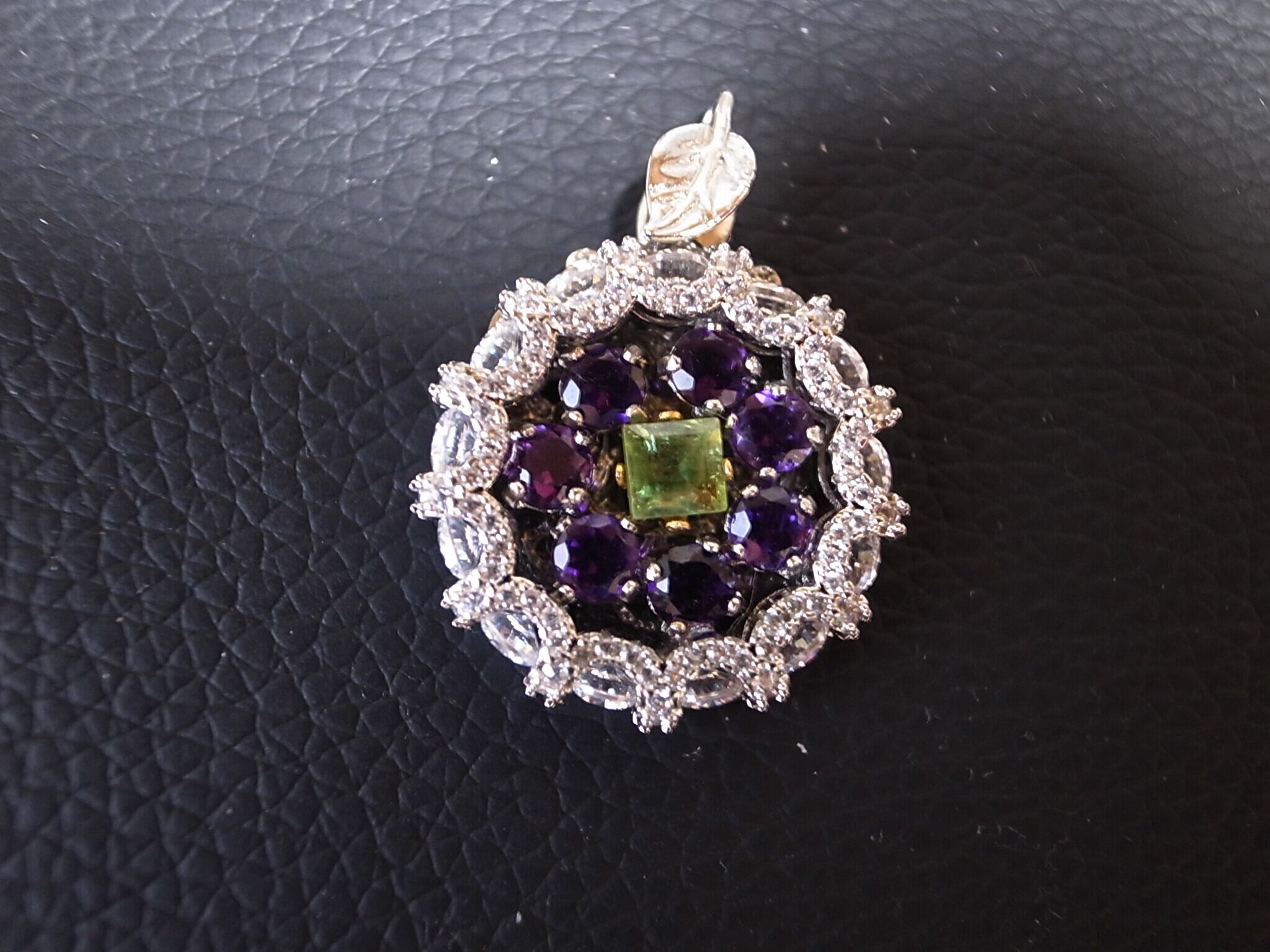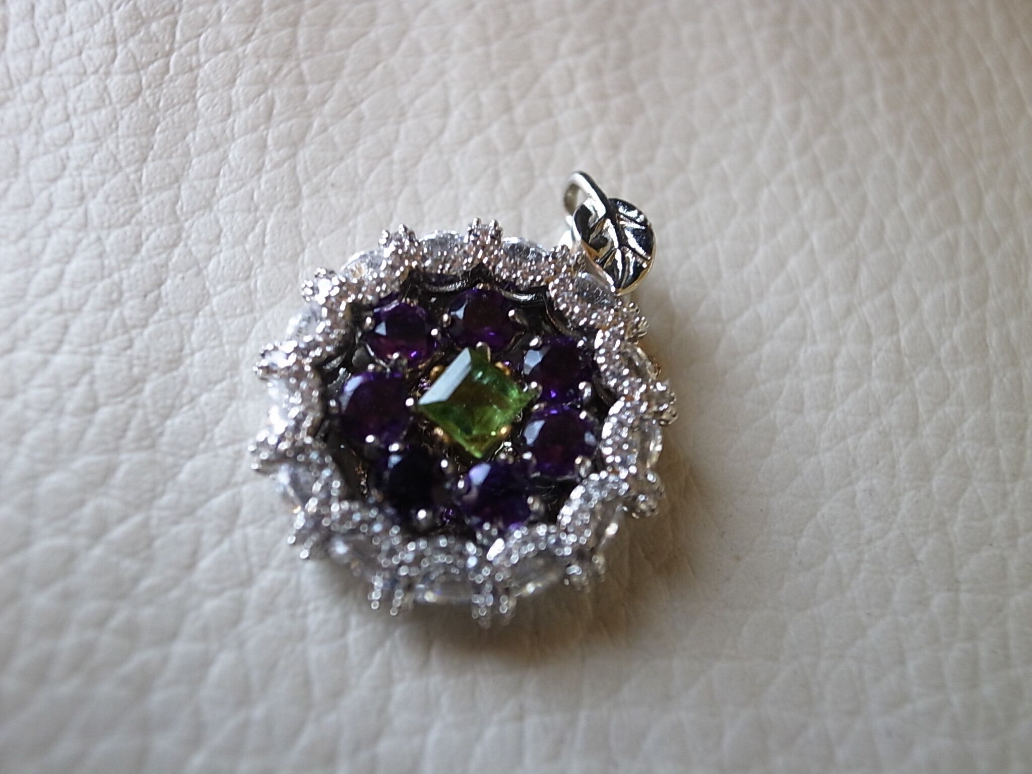 アメジストとトルマリンでネックレスヘッドを作りました。アメジストは晶洞のように外側を形成し、真ん中に緑のトルマリンを配置しています。なにか巨峰とマスカットのような感じにも見えます。