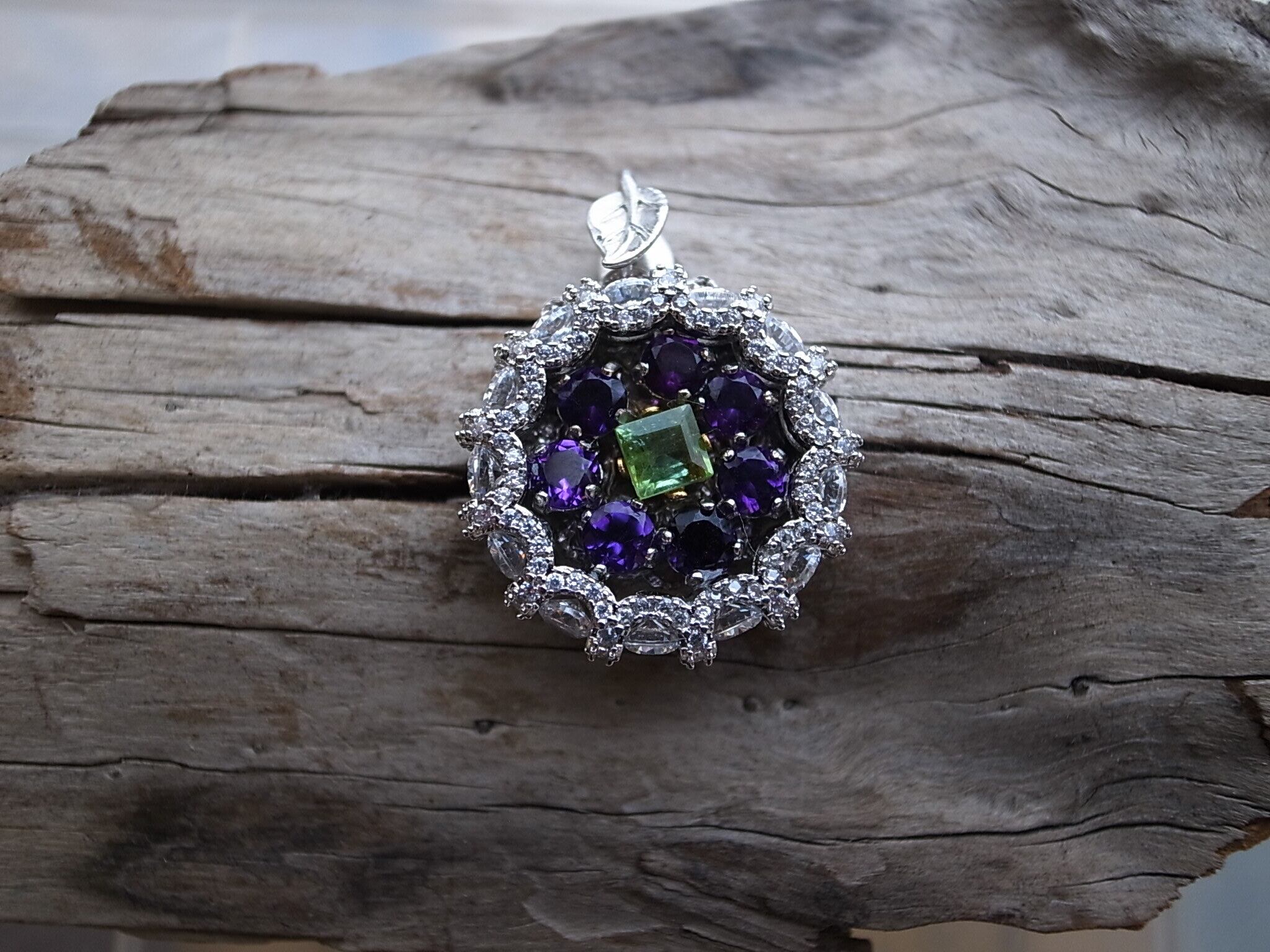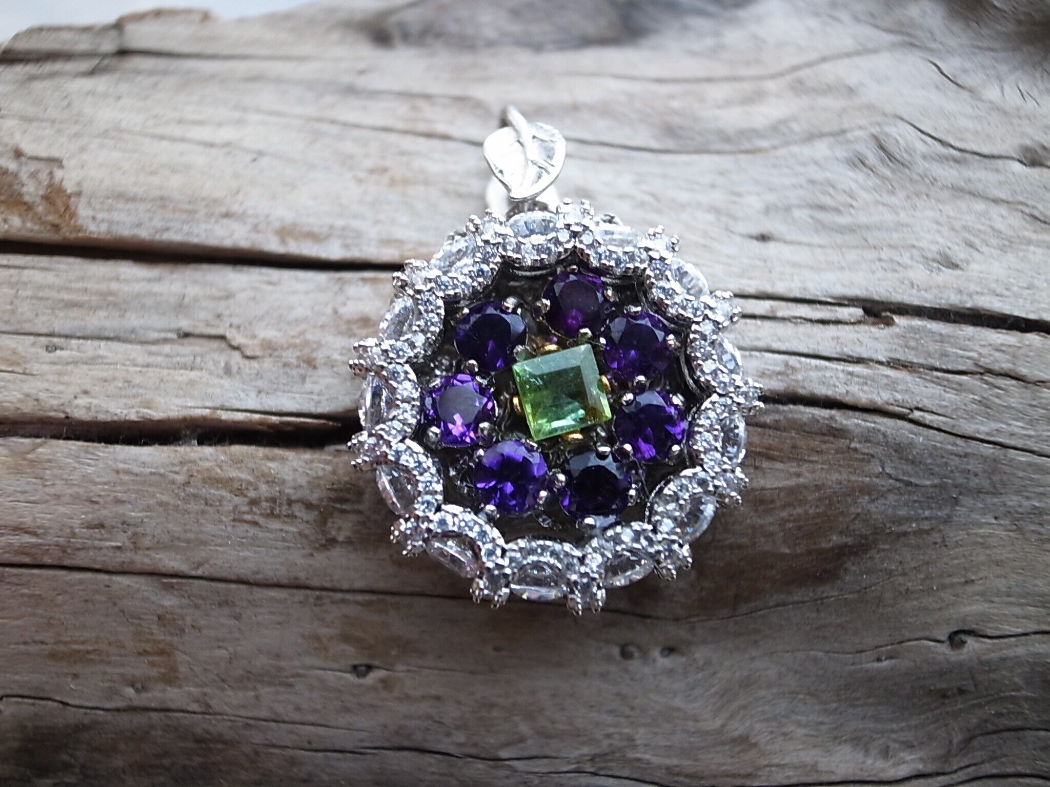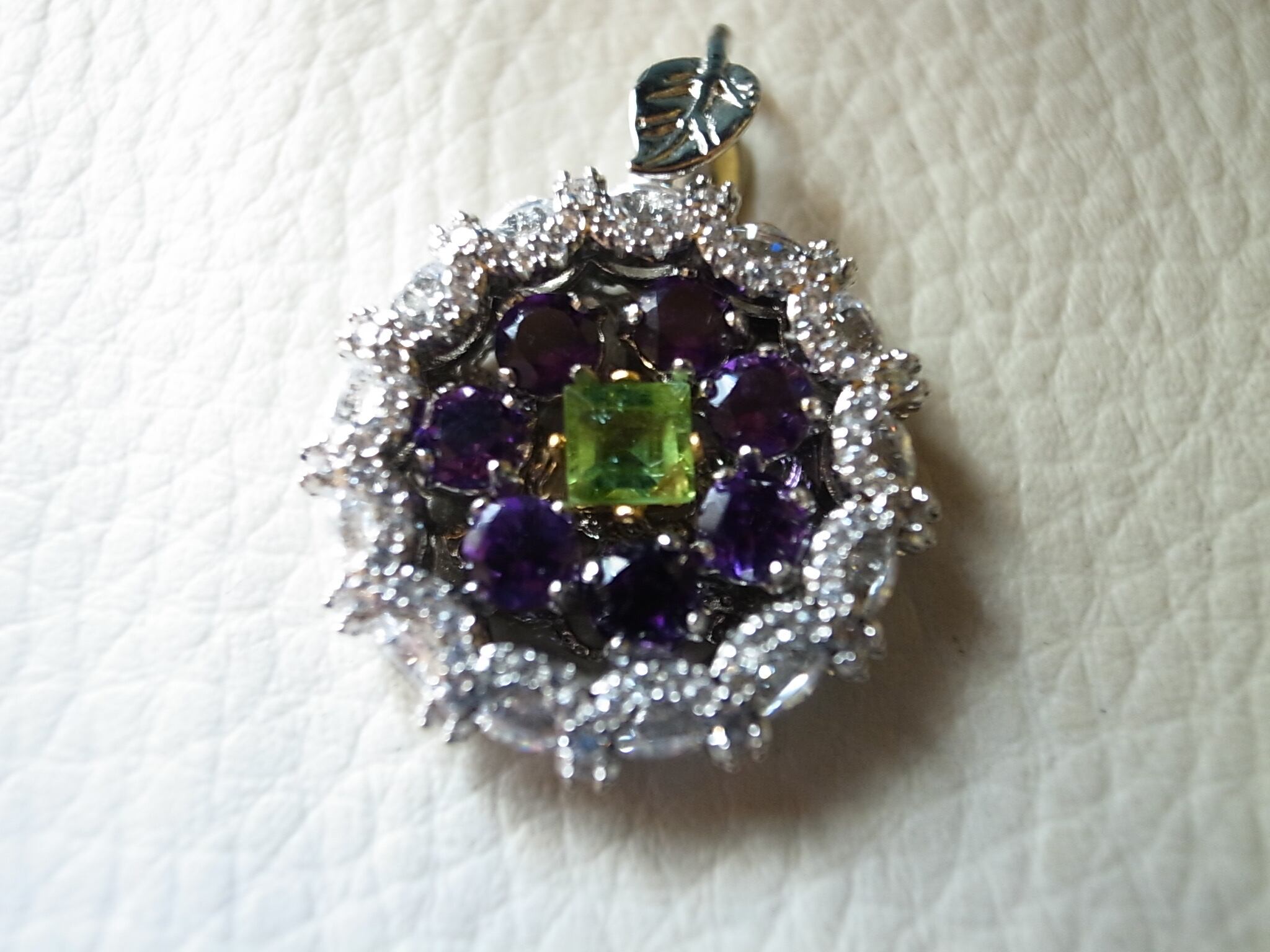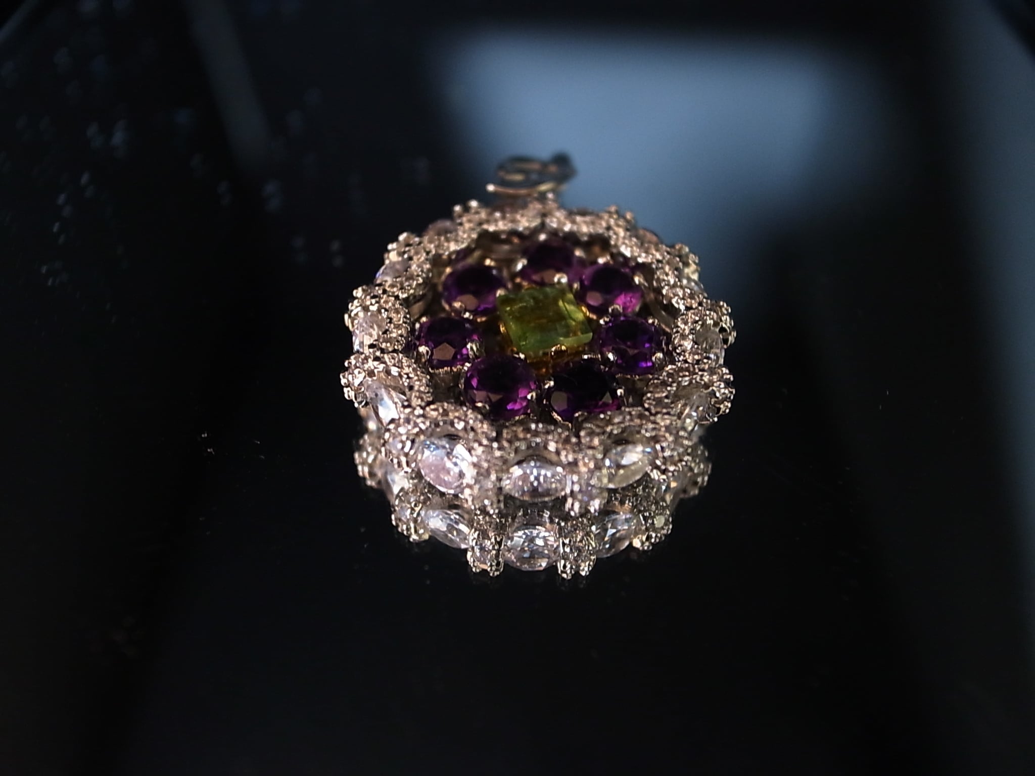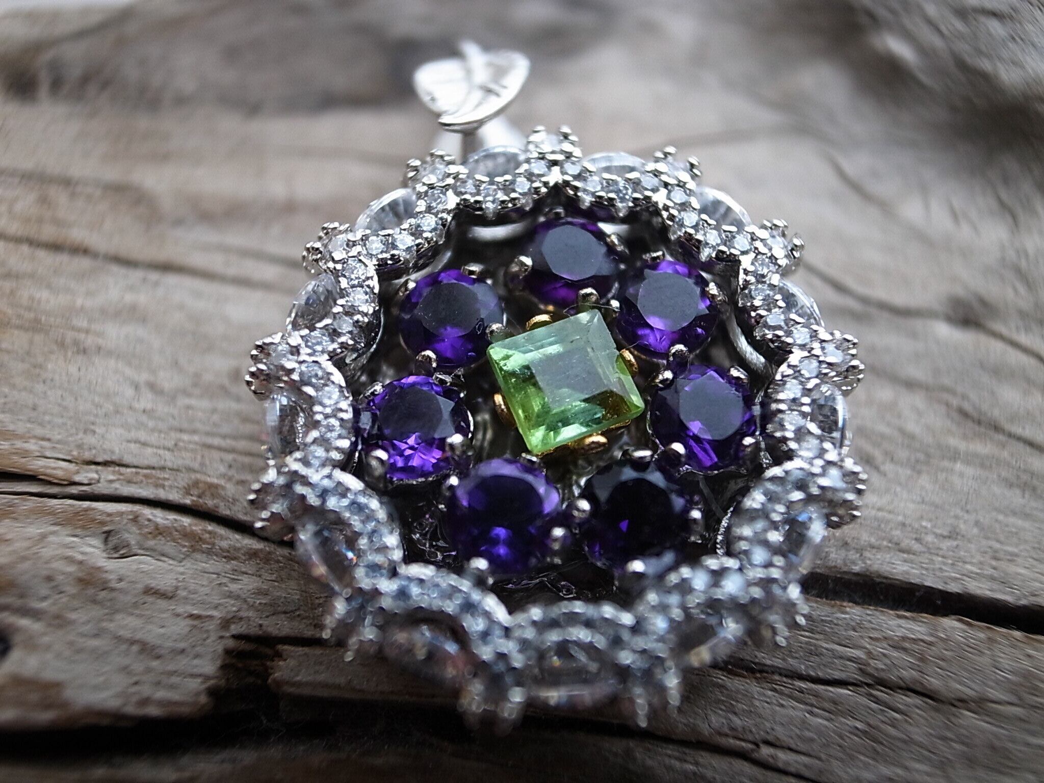 アメジストとトルマリンでネックレスヘッドを作りました。アメジストは晶洞のように外側を形成し、真ん中に緑のトルマリンを配置しています。なにか巨峰とマスカットのような感じにも見えます。