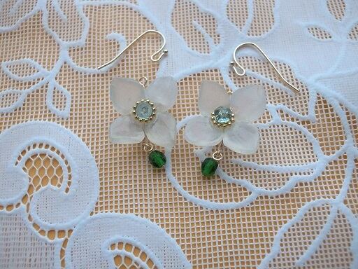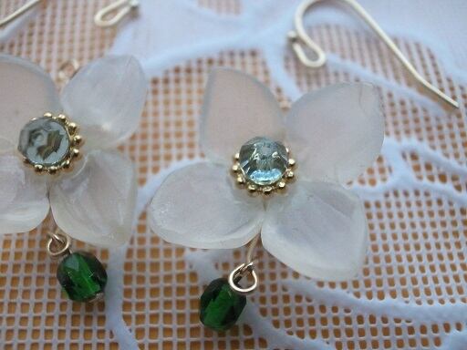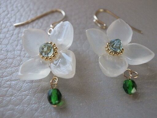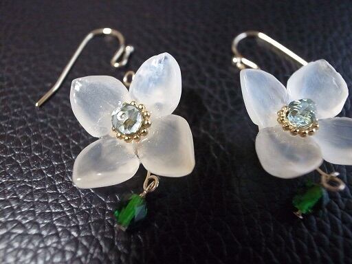 北海道のメノウで作成した花のピアスです。真ん中のグラスは、スワロフスキーです。9ピンとTピンは、ゴールドフィルドを使用しています。