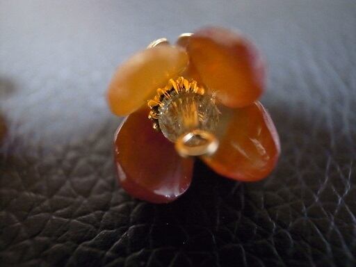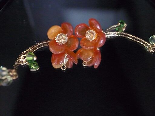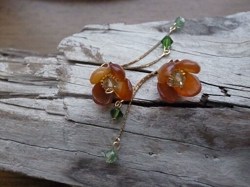 梅をイメージして作成したピアスです。真ん中のガラスはスワロスキーです、周りより明るい色なので光って見えます。9ピン、Tピン(一番下の緑のスワロフスキーを止めている部分)はゴールドフィルドを使用しています。