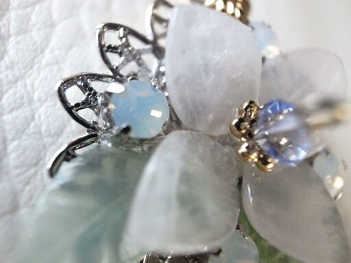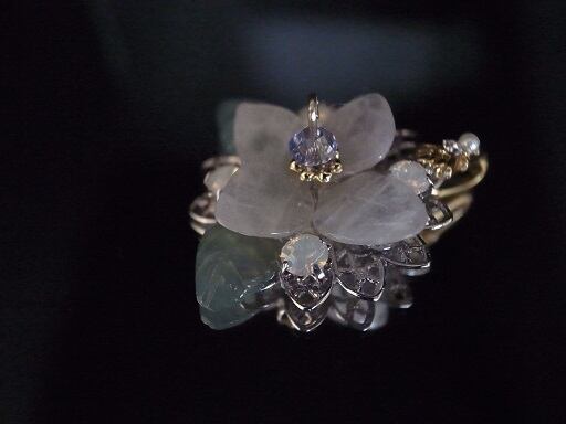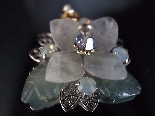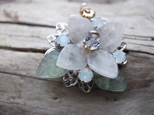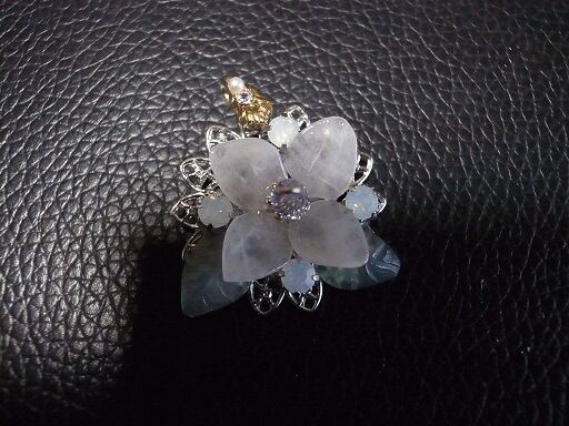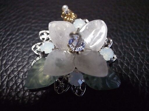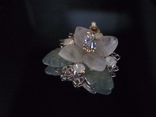 アジサイのブローチ(実際にはネックレスヘッド)を作成しました。花びら部分は、ピンク・クオーツ、葉っぱ部分は、グリーン・オニキスを削って磨いています。花の中心部分は青いスワロフスキーを使用しています。白い朝露をイメージした部分は、オパール色のクリスタルです。9ピン部分はゴールドフィルドを使用しています。