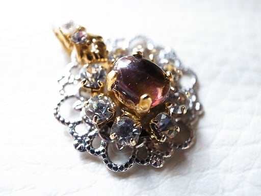 トルマリンでネックレスヘッドを作りました。回りはクリスタルの透明な連爪で巻いています。普段使いで使えるネックレスヘッドです。銀色と金色のコントラストは考えて作ったつもりです。