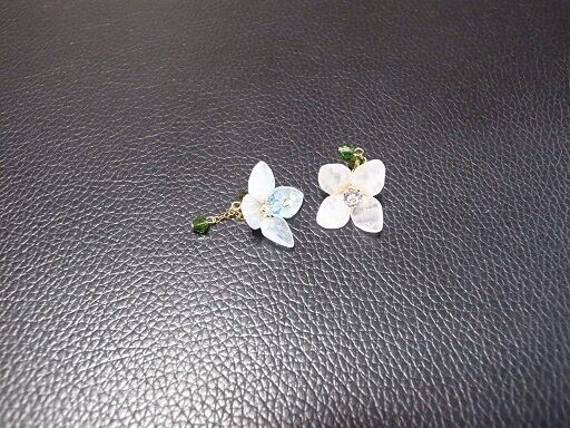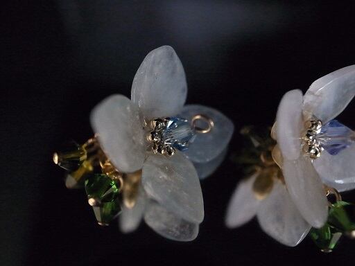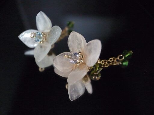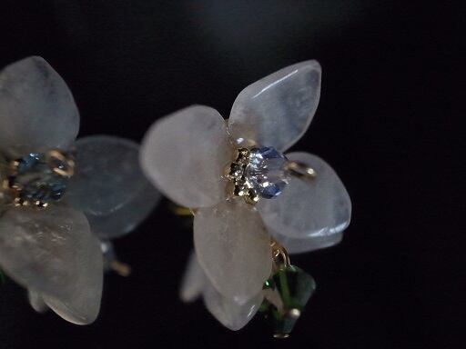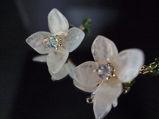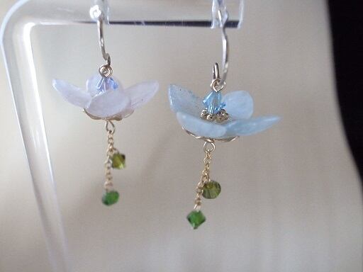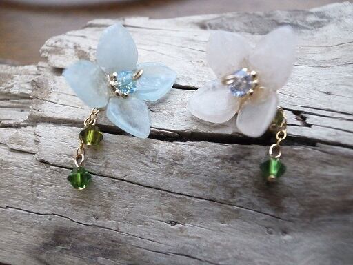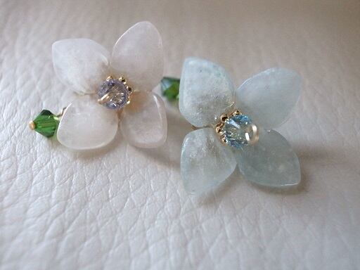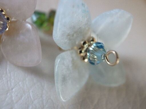 2色のアジサイです。一方がピンククオーツで、もう一方がアクアマリンです。鎖や9ピン、Tピン等は、ゴールドフィルドを使用しています。真ん中のビーズや下の緑のビーズはスワロフスキーを使用しています。