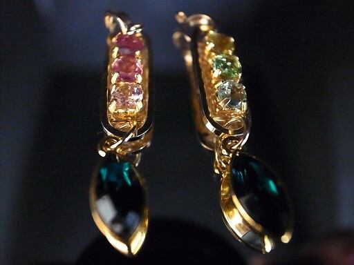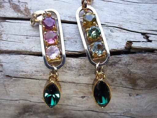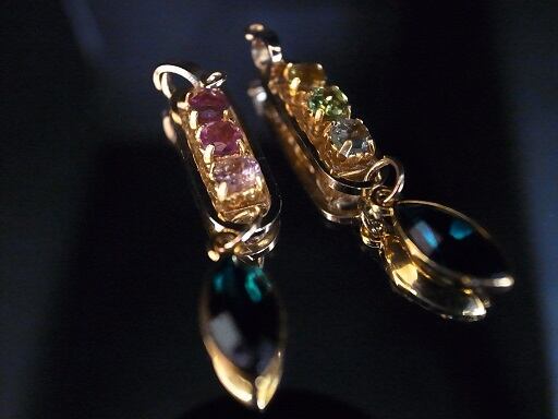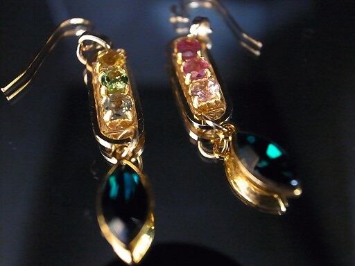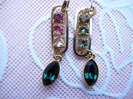イヤリングの上部、緑とピンクの部分はトルマリンで作成しました。したの濃いグリーン部分は、クリスタルです。南国の日差しに負けない避暑地をイメージしたアクセサリーです。