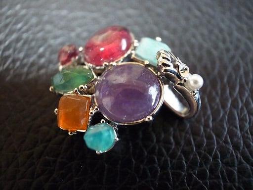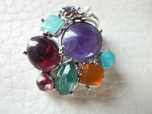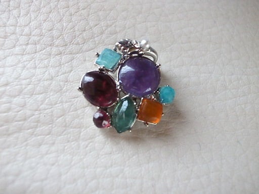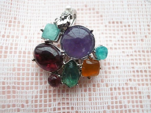 寄せ石座を利用して宝石を使いペンダント・ヘッドを作ってみました。すべて宝石です。私がカットして磨きました。真ん中の丸い紫色のアメジストから右回りに、アマゾナイト、オレンジ・メノウ、グリーン・オニキス、ガーネット、ガーネット、アクアマリンです。
