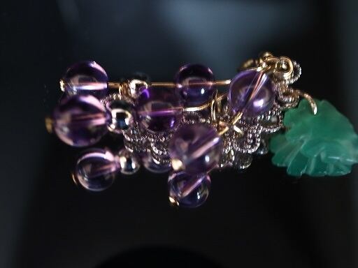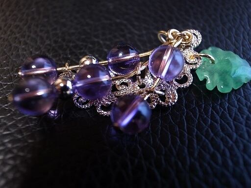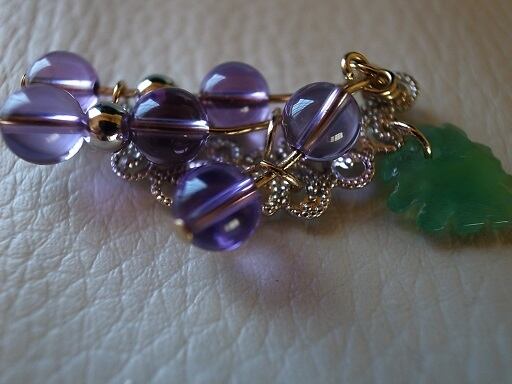ブドウをモティーフにはしましたが、少しディフォルメしてネックレスとして釣合うようにしてますので、ブドウの実の実物からは少し外れています。でも胸元で綺麗なように、こだわりました。特にバックの銀色の台座に合うように個数や配置を工夫したつもりです。