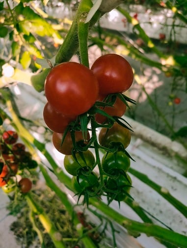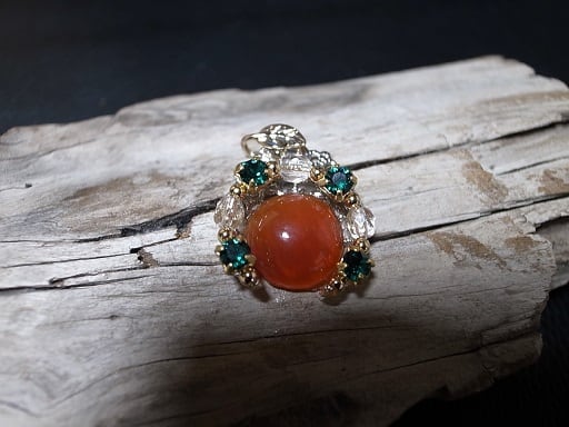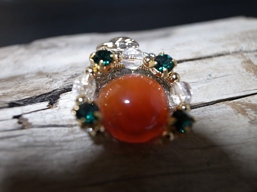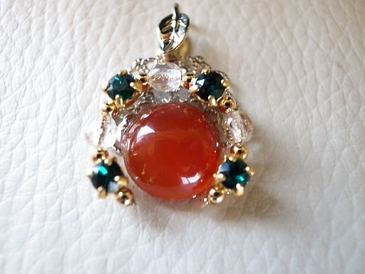 トマト狩りに行った時に思いついたトマトのアクセサリーです。赤い部分はカーネリアンをカットして磨きました。緑の部分はクリスタルです。元気のでるカラーだと思っています。