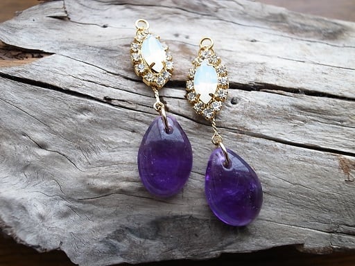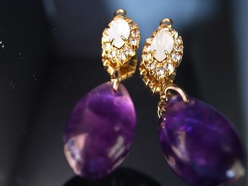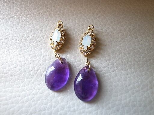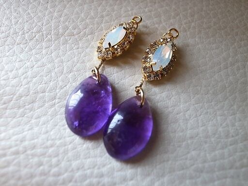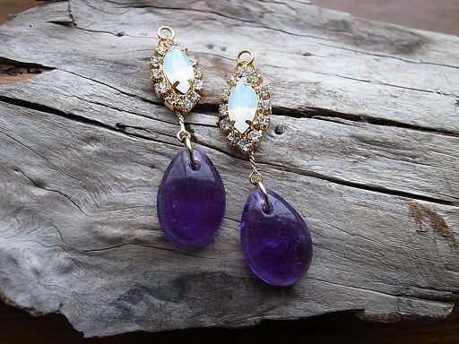 アメジストでピアスを作りました。高貴な色の紫をオパール色のクリスタルと金縁で演出しています。