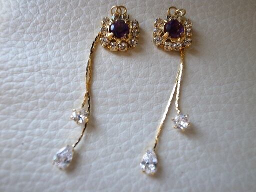 アメジストでピアスを作りました。アメジストは小さいですが、その分クオリティは高いです。下にクリスタルの飾りを垂らすようなデザインで、アメジストの周りもクリスタルです。小さいので何気ない感じでも付けられると思います。