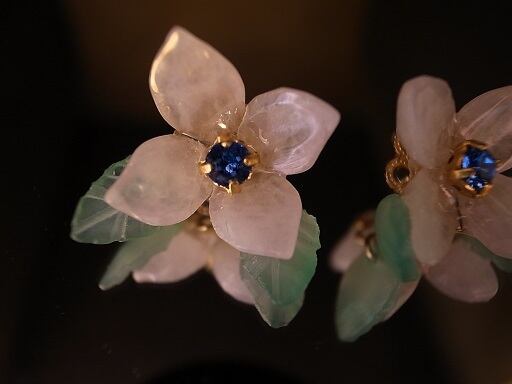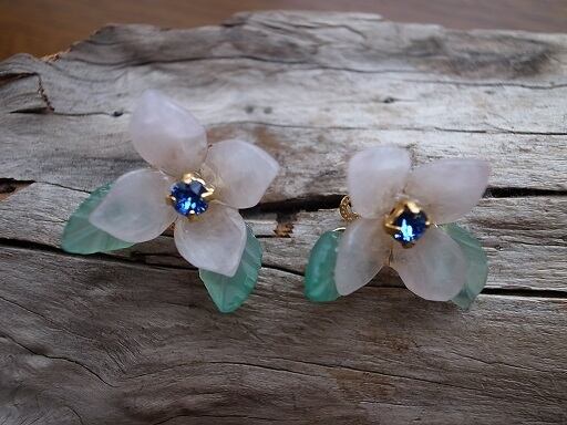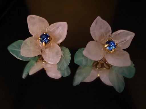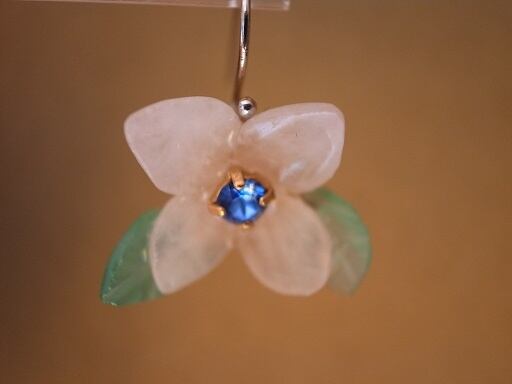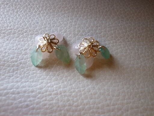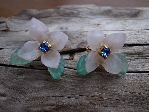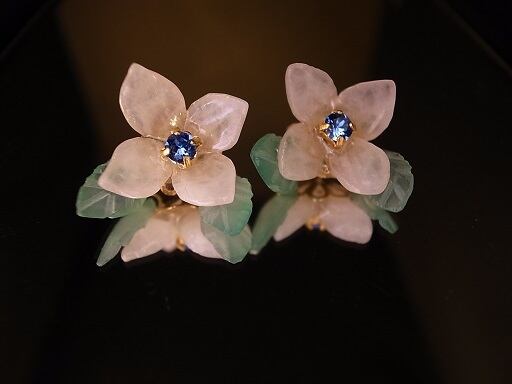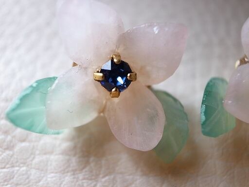 ピンククオーツと緑のオニキスでアジサイのピアスを作りました。真ん中は青色クリスタルです。クオーツやオニキスは自分でカットして磨いています。ピンクと緑の配色が上手くいきました。