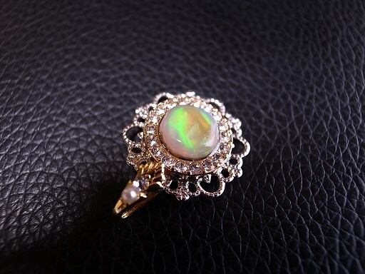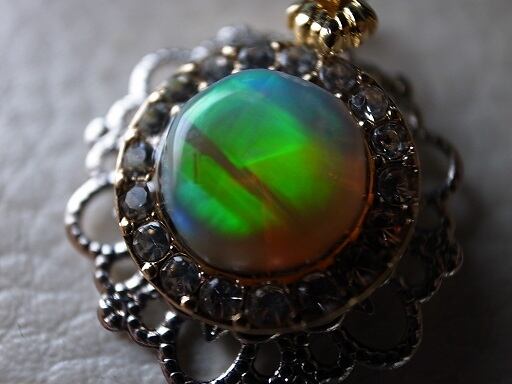 オパールをターコイズで使った技法で、原石カット研磨してペンダント・ヘッドを作ってみました。このオパールは、かなり光ります。角度にもよりますが、緑色に光ります。宝石本体は9mmほど、飾り金属を入れても2cmほどのアクセサリーですが、光るので存在感はあります。